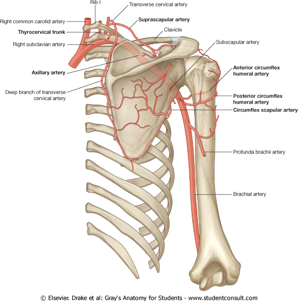 The suprascapular artery usually arises from the thyrocervical trunk of the subclavian artery, although it may arise from the third part of the subclavian artery