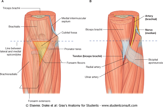 19.The Cubital Fossa:-The cubital fossa is an important area of transition between the arm and the forearm. It is located anterior to the elbow joint and is a triangular depression formed between two forearm muscles: