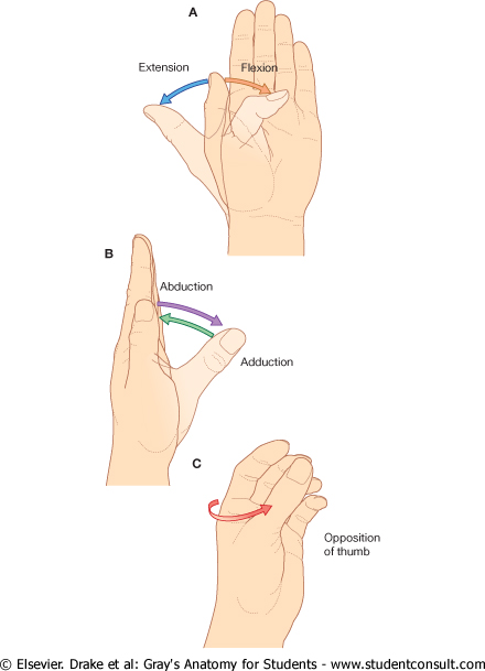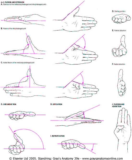 Flexion and extension should be confined to motion at the interphalangeal or metacarpophalangeal joints (Fig. 53.49A-C). Palmar abduction (Fig. 53.49D, E), in which the first metacarpal moves away from the second at right angles to the plane of the palm, and radial abduction (Fig. 53.49D, F), in which the first metacarpal moves away from the second with the thumb in the plane of the palm, occur at the carpometacarpal joint. The opposite of radial abduction is ulnar adduction, or transpalmar adduction, in which the thumb crosses the palm towards its ulnar border. In clinical practice the term adduction is generally used without qualification. Circumduction describes the angular motion of the first metacarpal, solely at the carpometacarpal joint, from a position of maximal radial abduction in the plane of the palm towards the ulnar border of the hand, maintaining the widest possible angle between the first and second metacarpals (Fig. 53.49G). Lateral inclinations of the first phalanx maximize the extent of excursion of the circumduction arc. Opposition is a composite position of the thumb achieved by circumduction of the first metacarpal, internal rotation of the thumb ray and maximal extension of the metacarpophalangeal and interphalangeal joints (Fig. 53.49H). Retroposition is the opposite to opposition (Fig. 53.49I). Flexion adduction is the position of maximal transpalmar adduction of the first metacarpal: the metacarpophalangeal and interphalangeal joints are flexed and the thumb is in contact with the palm (Fig. 53.49J).