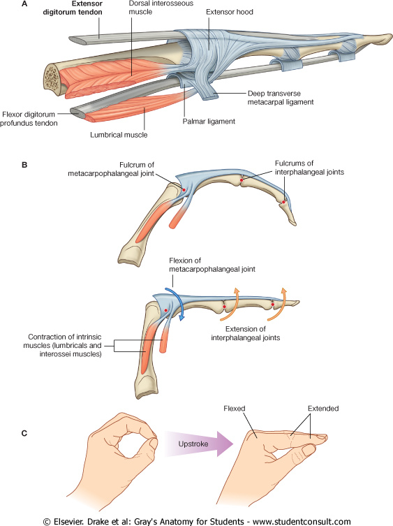 Because force from the small intrinsic muscles of the hand is applied to the extensor hood distal to the fulcrum of the metacarpophalangeal joints, the muscles flex these joints .Simultaneously, the force is transferred dorsally through the hood to extend the interphalangeal joints. This ability to flex the metacarpophalangeal joints, while at the same time extending the interphalangeal joints, is entirely due to the intrinsic muscles of the hand working through the extensor hoods. This type of precision movement is used in the ‘upstroke’ when writing a ‘t’.