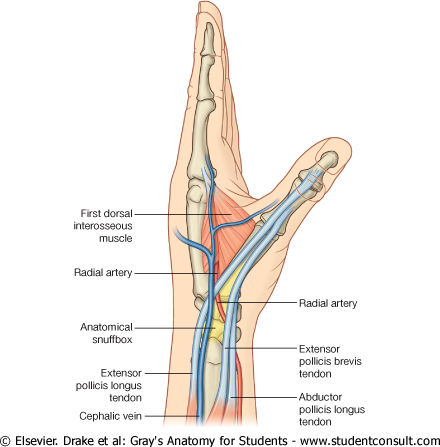 After passing around Lister’s tubercle, the tendon of extensor pollicis longus crosses the tendons of extensor carpi radialis brevis and longus obliquely .When the thumb is fully extended the tendon is separated from extensor pollicis brevis by a triangular depression or fossa, the so-called ‘anatomical snuff-box’. Bony structures can be felt in the floor of this fossa by deep palpation. In proximal to distal order they are the radial styloid, the smooth convex articular surface of the scaphoid, the trapezium, and the base of the first metacarpal. The latter are more easily felt during metacarpal movement, while the scaphoid is more easily felt during adduction and abduction of the hand