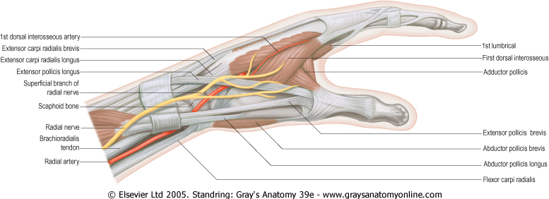 - the floor of the impression is formed by the scaphoid and trapezium, and distal ends of the tendons of the extensor carpi radialis longus and extensor carpi radialis brevis.