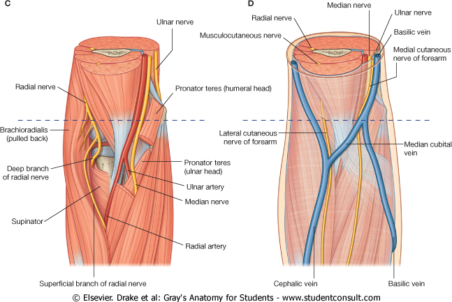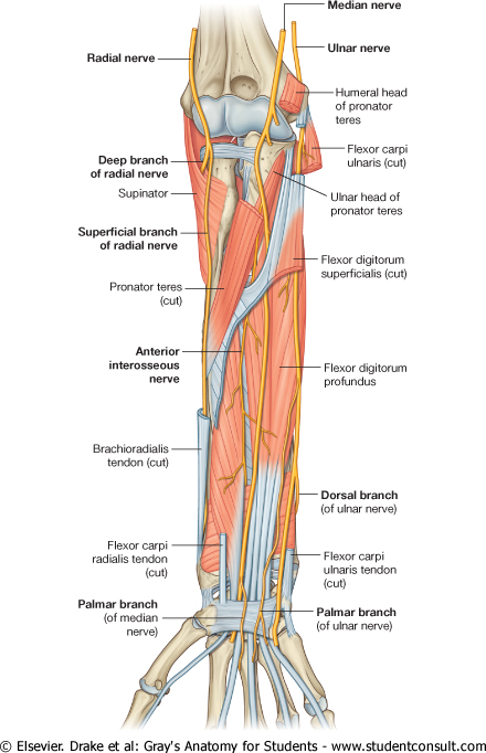 Most branches to the muscles in the superficial and intermediate layers of the forearm originate medially from the nerve just distal to the elbow joint: