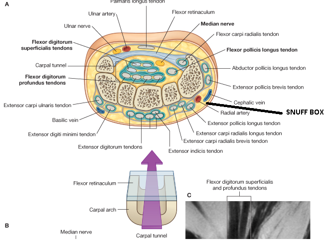 The ‘anatomical snuffbox’ is a term given to the triangular depression formed on the posterolateral side of the wrist and metacarpal I by the extensor tendons passing into the thumb . Historically, ground tobacco (snuff) was placed in this depression before being inhaled into the nose. The base of the triangle is at the wrist and the apex is directed into the thumb. The impression is most apparent when the thumb is extended: