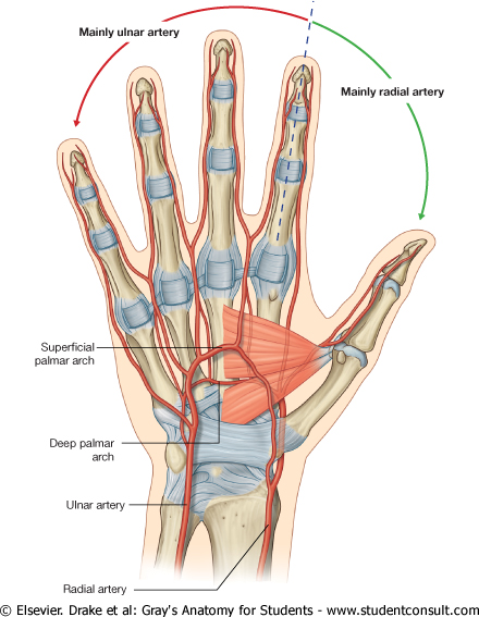 The radial artery curves around the lateral side of the wrist, passes over the floor of the anatomical snuffbox and into the deep plane of the palm by penetrating anteriorly through the back of the hand . It passes between the two heads of the first dorsal interosseous muscle and then between the two heads of the adductor pollicis to access the deep plane of the palm and form the deep palmar arch.