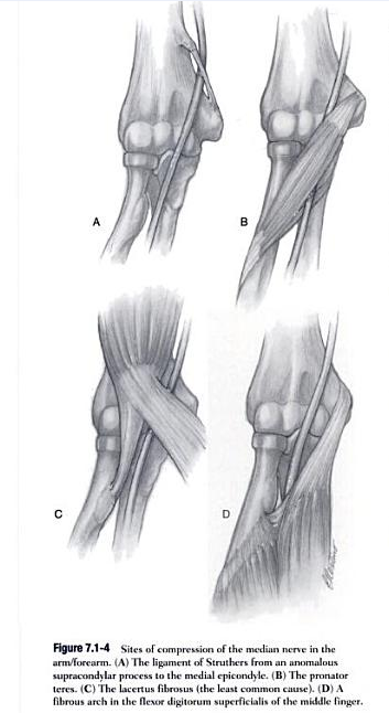 - the pronator teres muscle originating from the medial epicondyle of the humerus