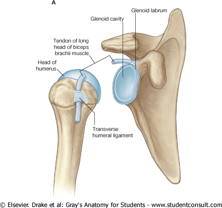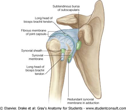- anterosuperiorly in three locations to form superior, middle, and inferior glenohumeral ligaments, which pass between the superomedial margin of the glenoid cavity to the lesser tubercle and inferiorly related anatomical neck of the humerus
