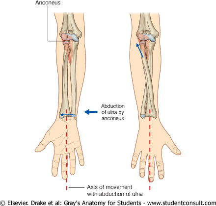 Anconeus assists triceps in extending the elbow joint. Its major function is not clear, but it may be the control of ulnar abduction in pronation, which is necessary if the forearm is to turn over the hand without translating it medially. In this way a tool can be revolved ‘on the spot’ or it can be swept through an arc.Anconeus abducts the ulna during pronation to maintain the center of the palm over the same point when the hand is flipped.