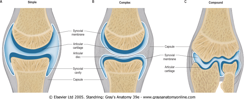 A and B are purely diagrammatic and not related to particular joints. C, however, is a simplified representation of some features of an elbow joint but the complicated contours due to the olecranon, coronoid and radial fossae and profiles of articular fat pads present in a true section have been omitted.