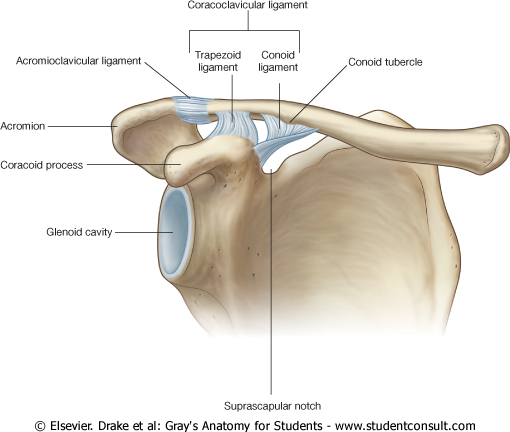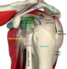 - superiorly between the base of the coracoid process and the greater tubercle of the humerus (the coracohumeral ligament);