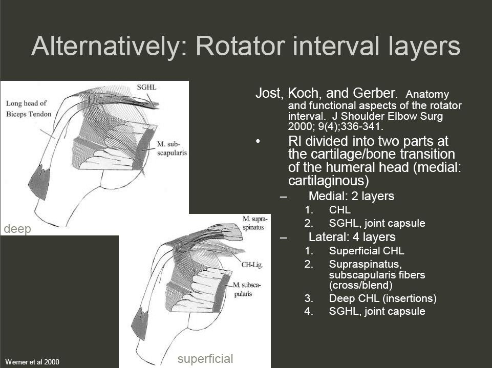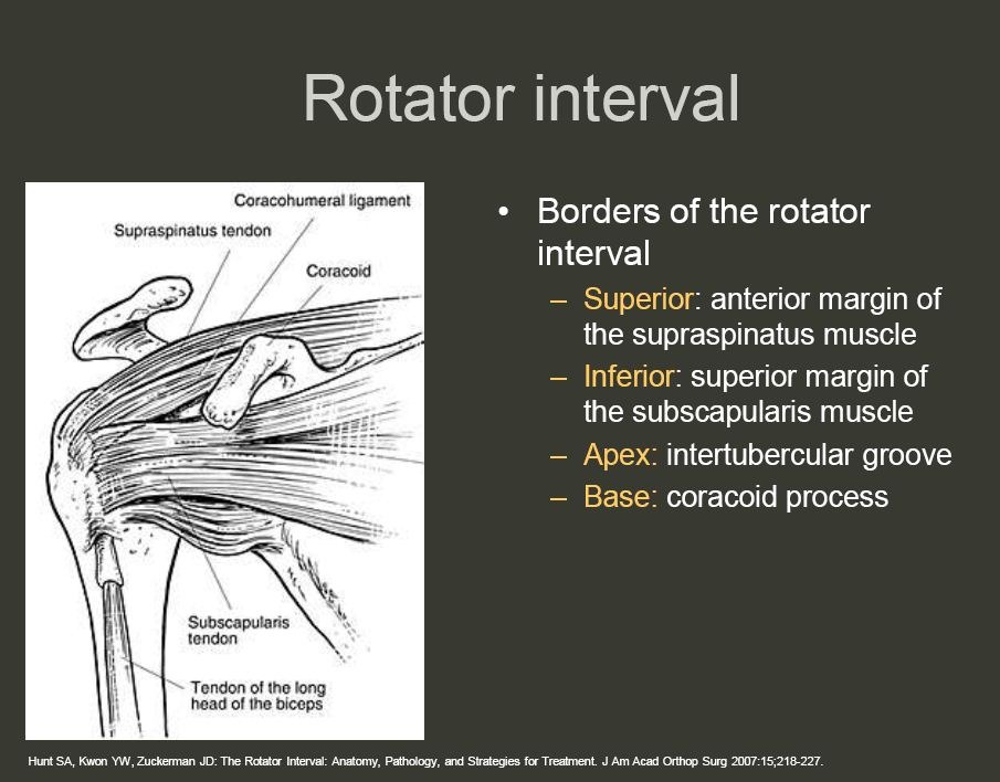 7. Rotator Interval in detail :-The rotator cuff interval is a triangular space between the subscapularis and supraspinatus tendons and the base of the coracoid process, covered by the rotator interval capsule, whose main component is the coracohumeral ligament (CHL). The rotator cuff interval is a triangular space created by the intervention of the coracoid process between the subscapularis and supraspinatus muscles and tendons. The floor of the rotator cuff interval is the cartilage of the humeral head, and the roof of the rotator cuff interval is the rotator interval capsule, which links the subscapularis and supraspinatus tendons and is composed of two layers: the CHL on the bursal side and the fasciculus obliquus on the articular side.The rotator interval is an anatomic region in the anterosuperior aspect of the glenohumeral joint that represents a complex interaction of the fibers of the coracohumeral ligament, the superior glenohumeral ligament, the glenohumeral joint capsule, and the supraspinatus and subscapularis tendons. As basic science and clinical studies continue to elucidate the precise role of the rotator interval, understanding of and therapeutic interventions for rotator interval pathology also continue to evolve. Lesions of the rotator interval may result in glenohumeral joint contractures, shoulder instability, or in lesions to the long head of the biceps tendon. Long-term clinical trials may clarify the results of current surgical interventions and further enhance understanding of the rotator interval.