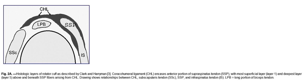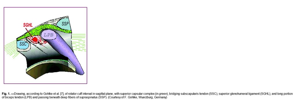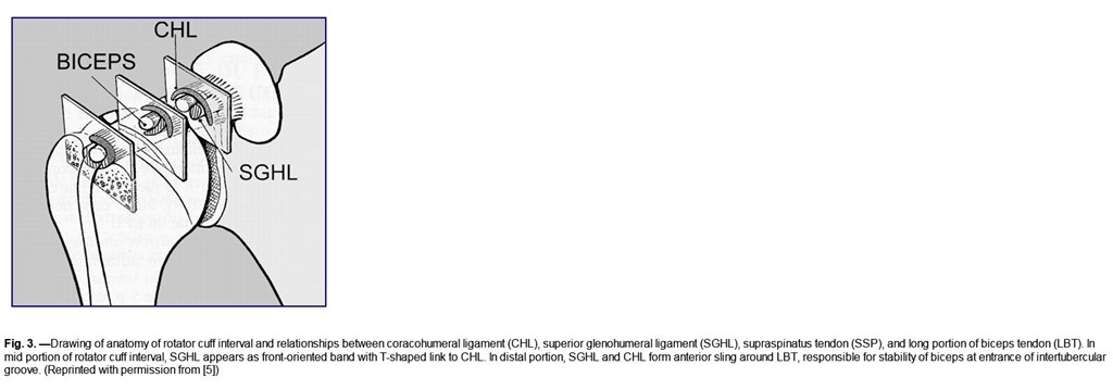 The rotator cuff interval is a triangular space between the subscapularis and supraspinatus tendons and the base of the coracoid process, covered by the rotator interval capsule, whose main component is the coracohumeral ligament (CHL). The rotator cuff interval contains the long head of the biceps tendon (LBT) and the superior glenohumeral ligament (SGHL) [1–6]. The relationships between the CHL, the SGHL, and the LBT are complex and may be difficult to analyze on MRI because of the variable appearance of the CHL.