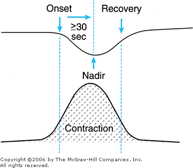 Features of late feta l heart rate deceleration. Characteristics include gradual decrease in the heart rate with the nadir and recovery occurring after the end of the contraction. The nadir of the deceleration occurs 30 seconds or more after the onset of the deceleration.