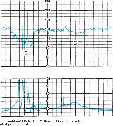 Two different fetal heart rate patterns during second-stage labor that are likely both due to head compression. Maternal bearing-down efforts correspond to the spikes with uterine contractions. Fetal heart rate deceleration C is consistent with the pattern of head compression shown in Figure 18–12. Deceleration B, however, is “variable” in appearance because of its jagged configuration and may also represent cord occlusion.