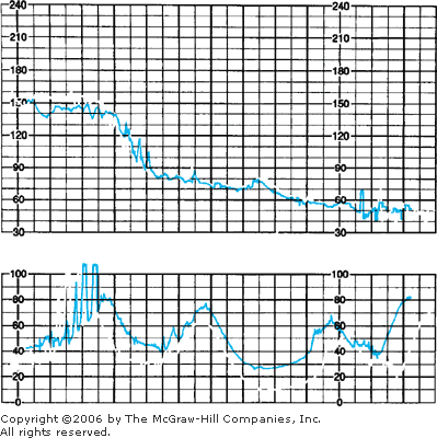 Some causes of fetal bradycardia include congenital heart block and serious fetal compromise. Figure 18–7 shows bradycardia in a fetus dying from placental abruption. Maternal hypothermia under general anesthesia for repair of a cerebral aneurysm or during maternal cardiopulmonary bypass for open-heart surgery also can cause fetal bradycardia (see Chap. 44, Valve Replacement During Pregnancy). Sustained fetal bradycardia in the setting of severe pyelonephritis and maternal hypothermia also has been reported (Hankins and co-workers, 1997). These infants apparently are not harmed by several hours of such bradycardia.