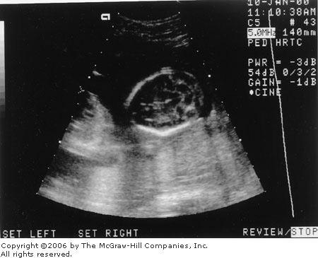 After confirming the gestational age and establishing fetal number and viability, the fetus is evaluated by targeted ultrasonography. Anencephaly, other major cranial defects, and most spine defects can be readily identified (Figs. 13–6 and 13–7). In 99 percent of cases, open spine lesions are associated with one or more of five specific cranial anomalies detected by ultrasonography (Watson and associates, 1991). As detailed in Chapter 16 (see Neural-Tube Defects), these include frontal notching, also called the lemon sign; small biparietal diameter; ventriculomegaly; obliteration of the cisterna magna; and elongated cerebellum, the banana sign (Fig. 13–8). These cranial anomalies are most clearly visible in the second trimester, and some, such as the lemon sign, may resolve later in pregnancy.