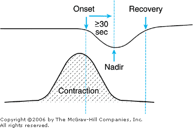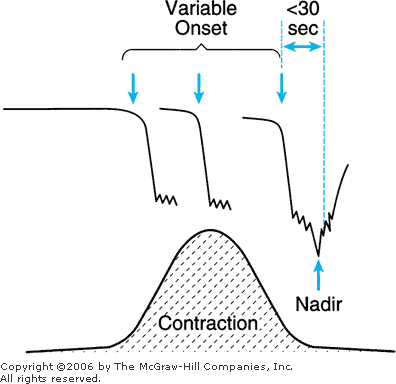 The fetal heart rate response to uterine contractions can be an index of either uterine perfusion or placental function. A late deceleration is a smooth, gradual, symmetrical decrease in fetal heart rate beginning at or after the peak of the contraction and returning to baseline only after the contraction has ended (American College of Obstetricians and Gynecologists, 1995b). In most cases, the onset, nadir, and recovery of the deceleration occur after the beginning, peak, and ending of the contraction, respectively (Fig. 18–16). The magnitude of late decelerations is rarely more than 30 to 40 beats/min below baseline and typically not more than 10 to 20 beats/min. Late decelerations usually are not accompanied by accelerations.