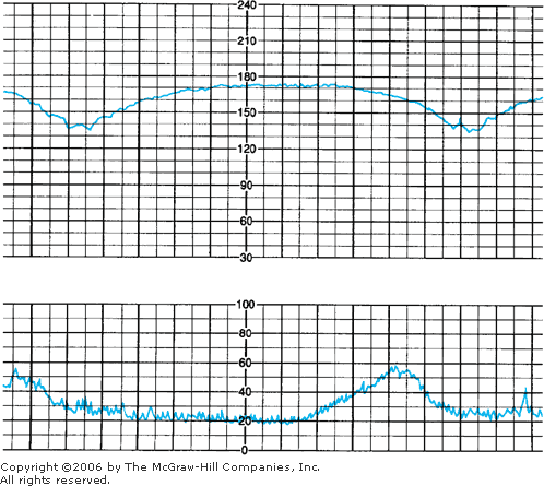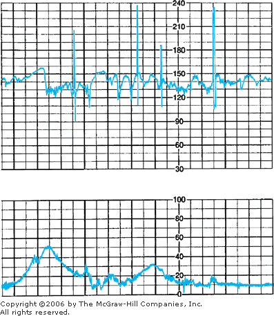 Severe maternal acidemia also can cause decreased fetal beat-to-beat variability, as shown in Figure 18–11 in a mother with diabetic ketoacidosis. The precise pathological mechanisms by which fetal hypoxemia results in diminished beat-to-beat variability are not totally understood.