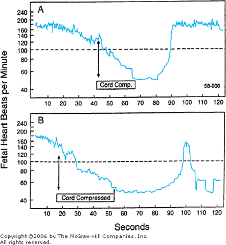 Fetal heart rate effects of compression of a prolapsed umbilical cord in a 25-week footling breech. Panel A shows the effects of 25-second compression compared with those of 40 seconds in panel B. (Redrawn from Hon, 1959, with permission.)