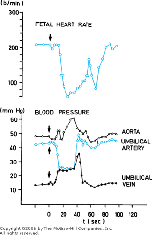 Ball and Parer (1992) concluded that variable decelerations are mediated vagally and that the vagal response may be due to chemoreceptor or baroreceptor activity, or both. Partial or complete cord occlusion produces an increase in afterload (baroreceptor) and a decrease in fetal arterial oxygen content (chemoreceptor). These both result in vagal activity leading to deceleration. In fetal monkeys the baroreceptor reflexes appear to be operative during the first 15 to 20 seconds of umbilical cord occlusion followed by decline in PO2 at approximately 30 seconds, which then serves as a chemoreceptor stimulus (Mueller-Heubach and Battelli, 1982).