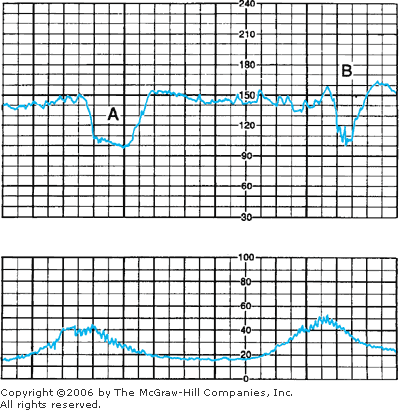 Two types of variable decelerations are shown in Figure 18–21. The deceleration denoted by A is very much like that seen with complete umbilical cord occlusion in experimental animals (see Fig. 18–20). Deceleration B, however, has a different configuration because of the “shoulders” of acceleration before and after the deceleration component. Lee and co-workers (1975) proposed that this variation of variable decelerations was caused by differing degrees of partial cord occlusion. In this physiological scheme, occlusion of only the vein reduces fetal blood return, thereby triggering a baroreceptor-mediated acceleration. Subsequent complete occlusion results in fetal systemic hypertension due to obstruction of umbilical artery flow. This stimulates a baroreceptor-mediated deceleration. Presumably, the aftercoming shoulder of acceleration represents the same events occurring in reverse (Fig. 18–22).