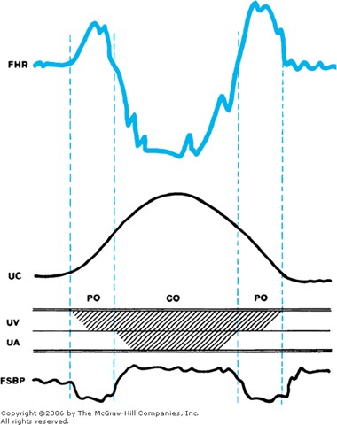 Schematic representation of the fetal heart rate (FHR) effects of partial occlusion (PO) and complete occlusion (CO) of the umbilical cord. (FSBP = fetal systemic blood pressure; UA = umbilical artery; UC = uterine contraction; UV = umbilical vein.) (From Lee and co-authors, 1975, with permission.)