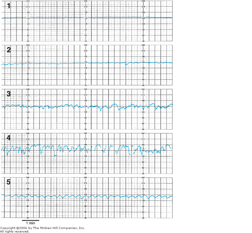 Grades of baseline fetal heart rate variability (irregular fluctuations in the baseline of 2 cycles per minute or greater) together with a sinusoidal pattern. The sinusoidal pattern differs from variability in that it has a smooth, sinelike pattern of regular fluctuation and is excluded in the definition of fetal heart rate variability. (1) Undetectable, absent variability; (2) minimal  5 beats/min variability; (3) moderate (normal), 6 to 25 beats/min variability; (4) marked, > 25 beats/min variability; (5) sinusoidal pattern. (From National Institute of Child Health and Human Development Research Planning Workshop, 1997.)