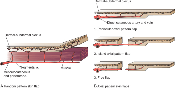 Discussion of skin grafting requires a basic review of skin anatomy. Skin is comprised of 5% epidermis and 95% dermis. The dermis contains sebaceous glands, whereas sweat glands and hair follicles are located in the subcutaneous tissue. The dermal thickness and concentration of skin appendages vary widely from one location to another on the body. The skin vasculature is superficial to the superficial fascial system and parallels the skin surface. The cutaneous vessels branch at right angles to penetrate subcutaneous tissue and arborize in the dermis, finally forming capillary tufts between dermal papillae.4