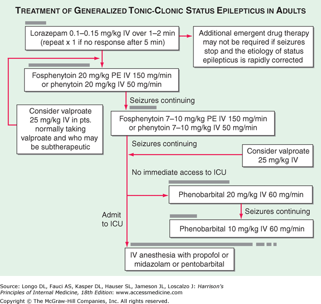 Status epilepticus is a medical emergency. Initial management includes maintenance of the airway and 50% dextrose (25–50 mL) intravenously in case hypoglycemia is responsible. If seizures continue, an intravenous bolus of lorazepam, 4 mg, is given and repeated once after 10 minutes if necessary; alternatively, 10 mg of diazepam is given intravenously over the course of 2 minutes, and the dose is repeated after 10 minutes if necessary. This is usually effective in halting seizures for a brief period but occasionally causes respiratory depression.
