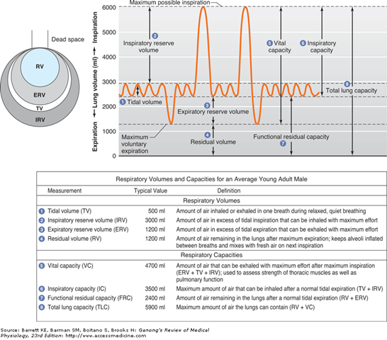 Lung volumes and capacity measurements.Top left: A cartoon figure representing lung space divided into lung volumes. Dead space refers to areas where gas exchange does not occur; all other spaces are defined in the accompanying table. Top right: Spirometer recordings are shown with marked lung volumes and capacities. Table at bottom defines individual measurements and values from the top graphs. Note that residual volume, total lung capacity, and function residual capacity cannot be measure with a spirometer.[Widmaier EP, Raff H, Strang KT: Vander’s Human Physiology: The Mechanisms of Body Function, 11th ed. McGraw-Hill, 2008]