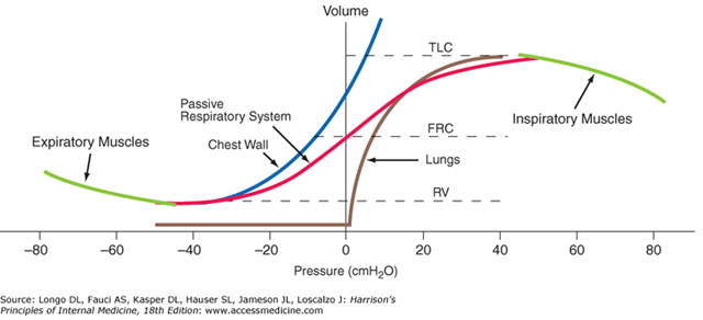Pressure-volume curves of the isolated lung, isolated chest wall, combined respiratory system, inspiratory muscles, and expiratory muscles. FRC, functional residual capacity; RV, residual volume; TLC, total lung capacity