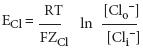 The equilibrium potential for Cl (ECl), calculated from the standard values listed in Table 1–1, is –70 mV, a value identical to the measured resting membrane potential of –70 mV. Therefore, no forces other than those represented by the chemical and electrical gradients need be invoked to explain the distribution of Cl across the membrane