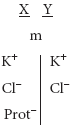 in which the membrane (m) between compartments X and Y is impermeable to charged proteins (Prot–) but freely permeable to K+ and Cl–. Assume that the concentrations of the anions and of the cations on the two sides are initially equal. Cl– diffuses down its concentration gradient from Y to X, and some K+ moves with the negatively charged Cl– because of its opposite charge. Therefore