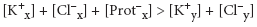 The Donnan effect on the distribution of ions has three effects in the body introduced here and discussed below. First, because of charged proteins (Prot–) in cells, there are more osmotically active particles in cells than in interstitial fluid, and because animal cells have flexible walls, osmosis would make them swell and eventually rupture if it were not for Na, K ATPase pumping ions back out of cells. Thus, normal cell volume and pressure depend on Na, K ATPase. Second, because at equilibrium the distribution of permeant ions across the membrane (m in the example used here) is asymmetric, an electrical difference exists across the membrane whose magnitude can be determined by the Nernst equation. In the example used here, side X will be negative relative to side Y. The charges line up along the membrane, with the concentration gradient for Cl– exactly balanced by the oppositely directed electrical gradient, and the same holds true for K+. Third, because there are more proteins in plasma than in interstitial fluid, there is a Donnan effect on ion movement across the capillary wall.