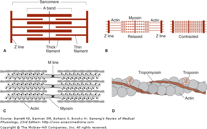 A) Arrangement of thin (actin) and thick (myosin) filaments in skeletal muscle (compare to Figure 5–2). B) Sliding of actin on myosin during contraction so that Z lines move closer together. C) Detail of relation of myosin to actin in an individual sarcomere, the functional unit of the muscle. D) Diagrammatic representation of the arrangement of actin, tropomyosin, and troponin of the thin filaments in relation to a myosin thick filament. The globular heads of myosin interact with the thin filaments to create the contraction. Note that myosin thick filaments reverse polarity at the M line in the middle of the sarcomere, allowing for contraction.